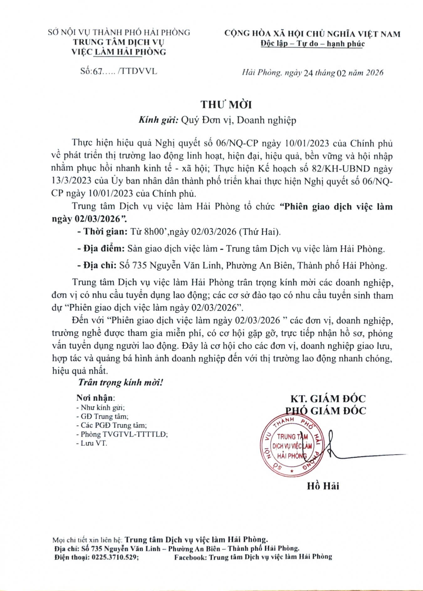 Nhằm kết nối hiệu quả Cung - Cầu lao động, hỗ trợ doanh nghiệp, đơn vị tìm kiếm nguồn nhân lực chất lượng và giúp người lao động tìm được việc làm phù hợp, Trung tâm Dịch vụ việc làm Hải Phòng trân trọng kính mời Quý Doanh nghiệp trên địa bàn thành phố đăng ký tham gia Phiên giao dịch định kì tại Trung Tâm